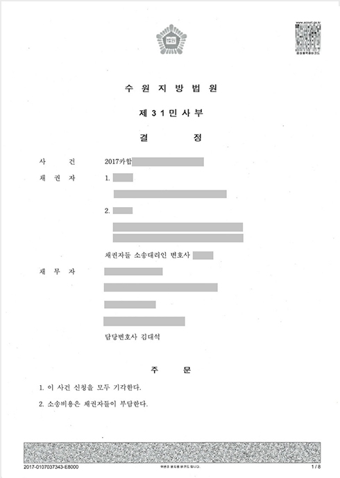 이에 수원변호사 법률사무소 재인은 해당 주택부지에 신축된 주택에 차량이 통행하기 위해서는피고 지역주택조합 소유의 도로를 통하지 않고서는 통행할 수 없고, 해당 신축 주택은 법정 주차면적을 충족하여주차 시설을 해 놓았고, 신축 목적 자체가 근린생활시설 및 주택으로 차량의 통행이 필수적이며,해당 지역주택조합의 사업 자체가 표류중에 있어 추후 진행될 가능성이 희박하는 점,원고가 지역주택조합 소유의 도로를 이용하더라도 실제 지역주택조합에 경미한 손해만이 가해질 뿐이라는 점,원고에게는 민법 제219조 주위토지통행권이 인정된다는 점을 주장하여 지역주택조합 소유의 사도를 통해통행방해행위를 금지한다는 가처분 결정을 이끌어 내어 공사 및 준공이 지연되지 않고 원하던 바대로컨테이너와 볼라드를 철거 및 이동하게 하는 만족스러운 결과를 이끌어 내었습니다.통행방해금지가처분_페이지_01.jpg)